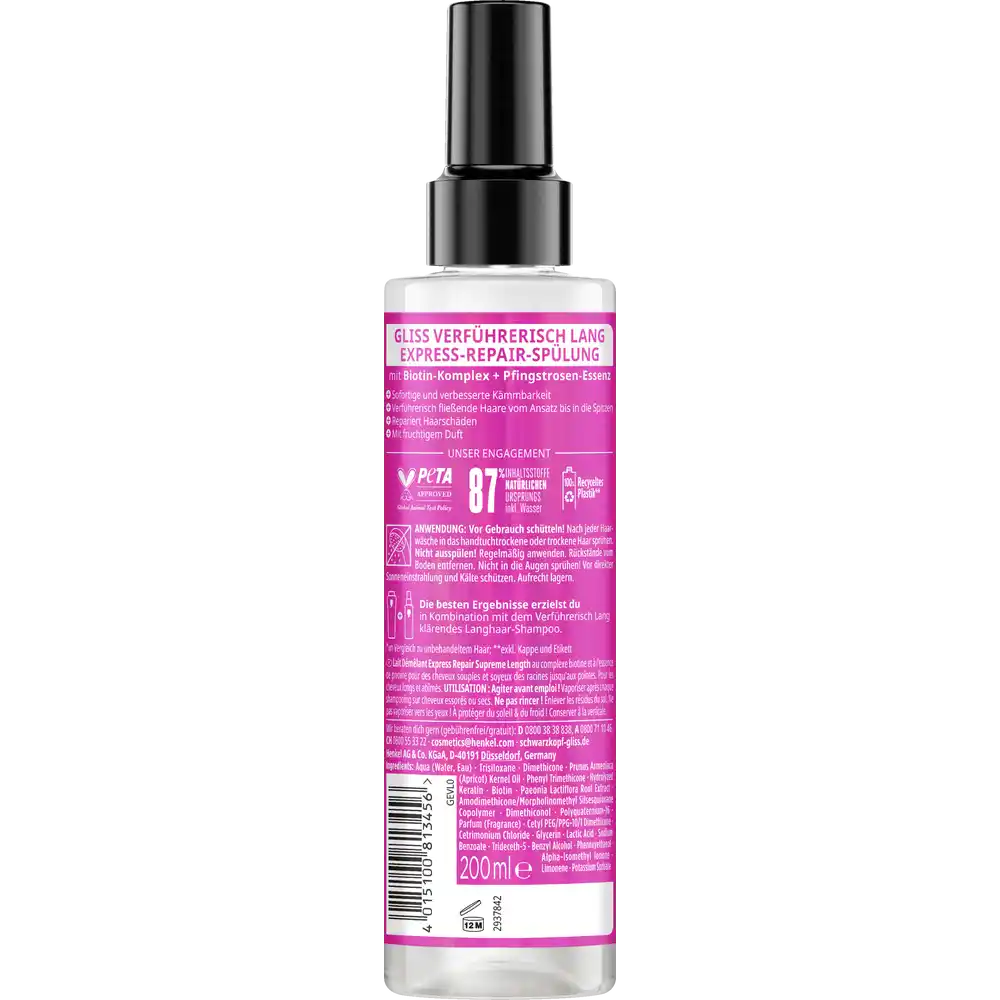 Schwarzkopf Gliss Seductively Longg Express-Repair Conditioner Spray is tailored to the needs of long, damaged hair, offering instant detangling and repair. It features a Biotin complex and Paeonia Lactiflora (Peony) root extract, which work together to strengthen hair strands from root to tip and help prevent future damage.