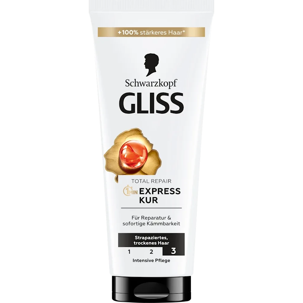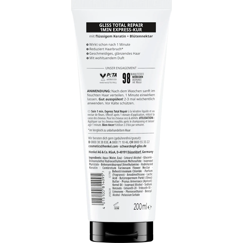 Transform damaged hair in just one minute with Schwarzkopf Gliss Hair Repair Total Repair 1-Min Express Treatment. This innovative treatment penetrates deeply, targeting the most vulnerable areas of your hair to repair damage from root to tip. Enriched with liquid keratin, it rebuilds hair structure while smoothing and softening strands, leaving hair visibly healthier and more resilient after just a single application.