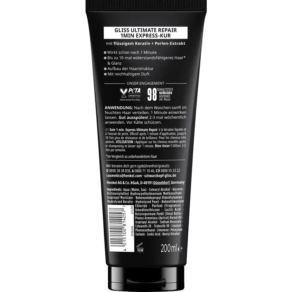 Schwarzkopf Gliss Ultimate Repair 1-Minute Express Treatment is a highly effective hair mask specially formulated for severely damaged hair. Its unique Liquid Keratin technology penetrates deep into the hair structure, repairing existing damage and preventing new breakage. The hair surface is smoothed, making hair more manageable and easier to comb, while the integrated heat protection shields hair from styling tools.