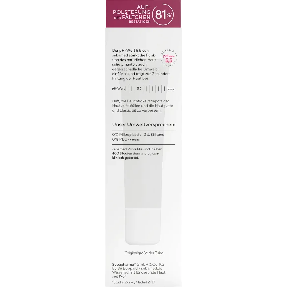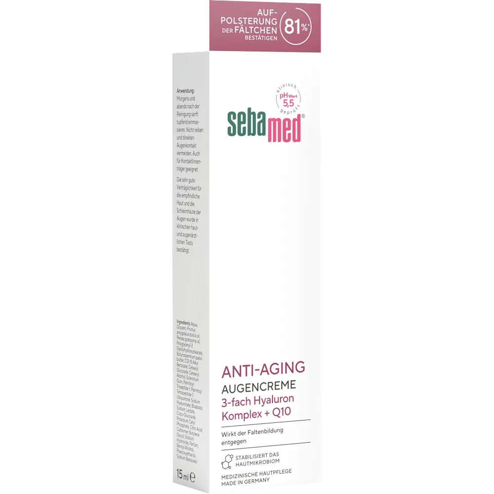 Sebamed Anti‑Aging Eye Cream (15 ml) is a specially developed smoothing moisture care to preserve the delicate skin around the eyes. Formulated for skin over 30, it combines triple hyaluronic acid, coenzyme Q10, and phyto‑peptides to intensely hydrate and visibly plump fine lines. Clinically dermatologically and ophthalmologically tested for excellent tolerance on sensitive skin and mucous membranes around the eyes.