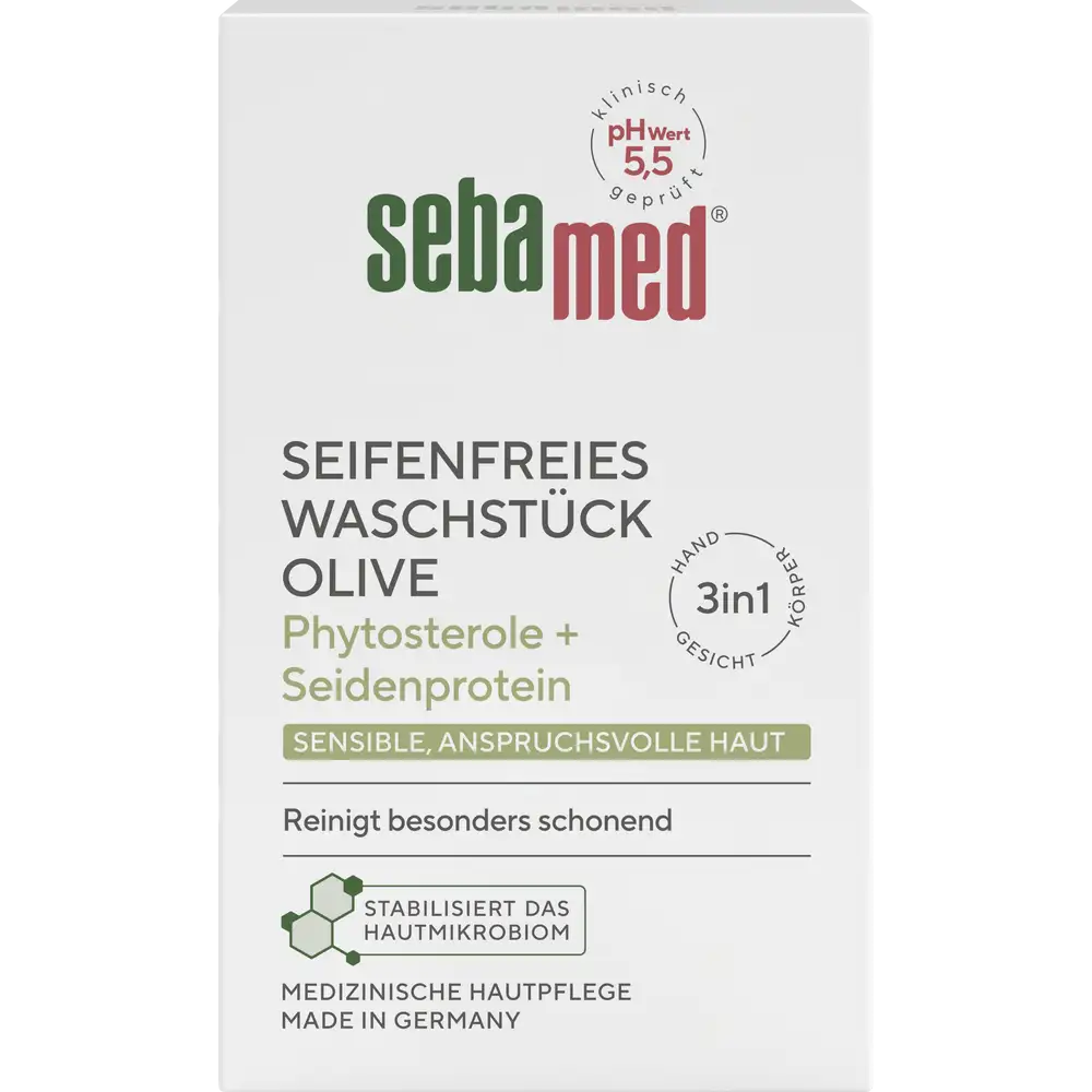 The Sebamed Seifenfreies Waschstück Olive 150 g is a soap-free cleansing bar specially formulated for sensitive and demanding skin. With a skin-friendly pH value of 5.5, it supports the natural protective acid mantle of the skin and helps maintain skin health even under exposure to environmental stress.