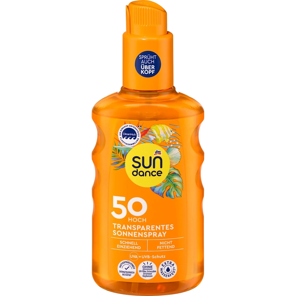 The SUNDANCE Sun Spray Transparent SPF 50 offers perfect instant protection as well as reliable UVA/UVB protection. The transparent formula leaves no white residue and is quickly absorbed without sticking. The transparent sun spray is also suitable for the scalp and is also extra waterproof*.