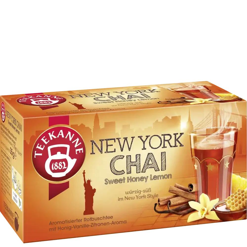 Temptingly sweet and pleasantly spicy: Just like life in New York, TEEKANNE also tastes New York Chai. A mild Rooibos base, refined by selected spices, meets the taste of sweet honey and fruity lemon and sends you on a pleasurable journey to the vibrant metropolis. Naturally sweet, low in calories and thanks to the rooibos tea without caffeine, this chai is probably the most enjoyable way to experience the lifestyle of New York.