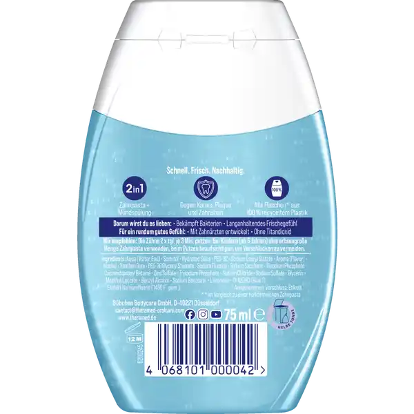 Theramed 2in1 Original-Fresh Toothpaste Gel combines the cleansing power of a toothpaste with the refreshing effect of a mouthwash, offering an all-round 2-in-1 oral care solution. It is formulated to protect against cavities (dental caries), reduce plaque and tartar buildup, and give you long-lasting freshness—without the extra step of using a separate mouthwash.